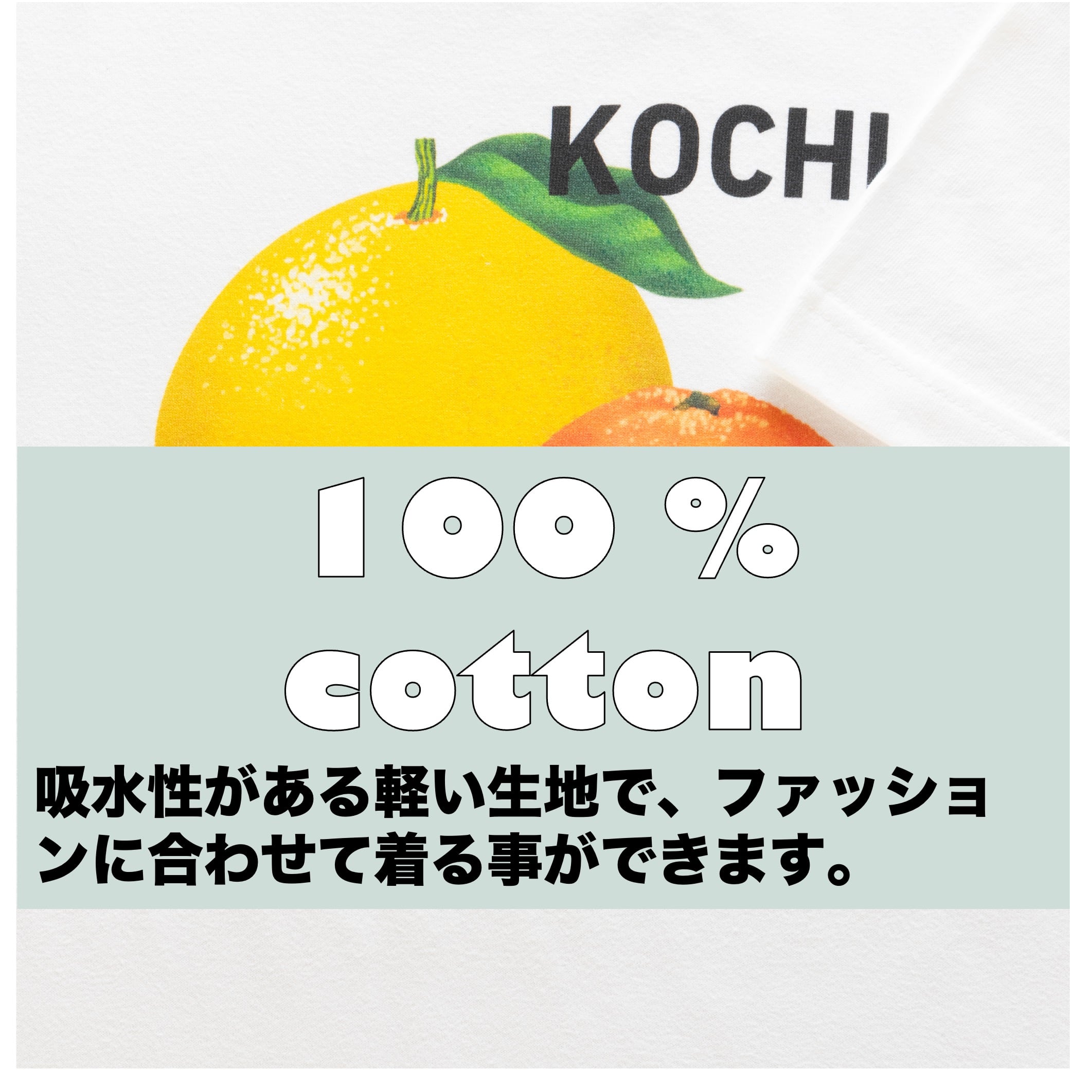 着心地や素材感にこだわった綿 100%の T シャツです。バニラホワイトのパキッとした白い生地に高知の特産品や魅力が詰まったイラストが映えます。